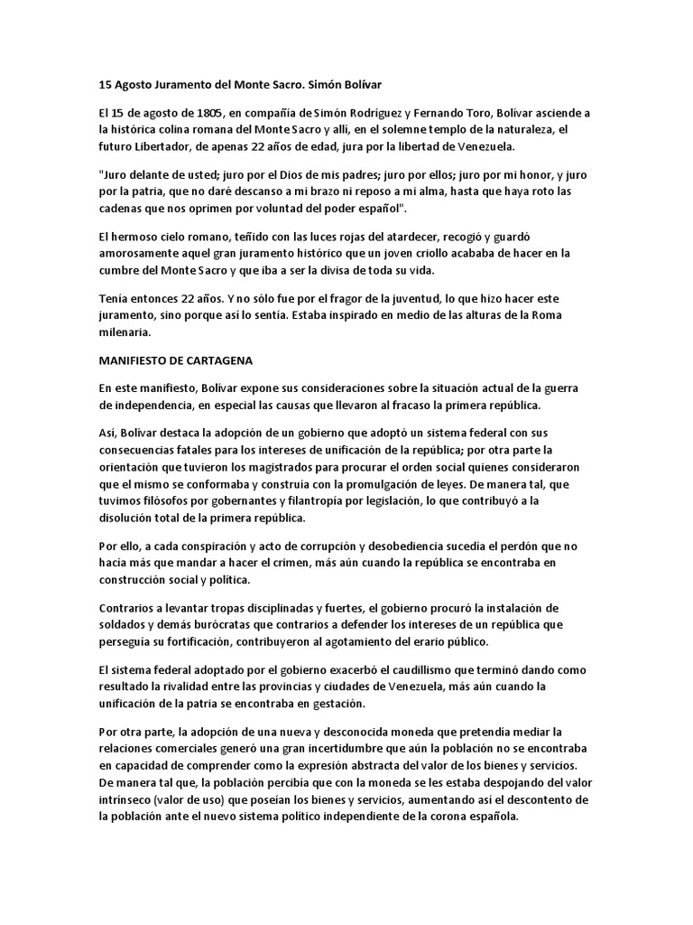 × 9 cm geographic subject: El 15 de agosto de 1805, en compañía de simón rodríguez y fernando rodríguez del toro, bolívar asciende a la histórica colina romana del monte sacro y allí, en el solemne templo de la naturaleza, el futuro libertador, de apenas 22 años de edad, jura por la libertad de venezuela con estas palabras: Hoy, 216 años después del 15 de agosto de 1805 cuando simón bolívar hizo el juramento en roma de «no dar reposo a mi alma hasta que haya roto las cadenas que nos oprimen por voluntad del pueblo español» el debate entre los autores no es por el texto del discurso, sino determinar con exactitud en cuál de las colinas de roma tuvo lugar el. La festividad de la asunción de la virgen, que se celebra cada año el 15 de agosto, coincide este 2021 en domingo, algo que hace que se quede en mano de cada una de las comunidades autónomas y. Sobre la fecha tuvo lugar este evento existe amplio consenso y documentación que permite asegurar que fue el 15 de agosto de 1805.